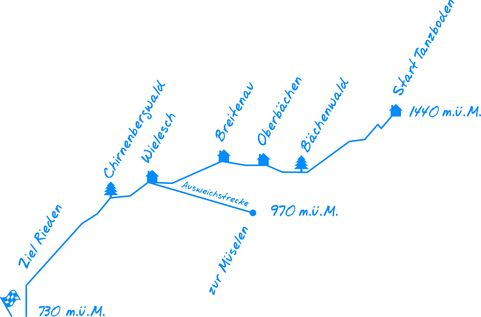 Das Derby startet auf der Alp Tanzboden und führt über die Oberbächen und das Wielesch ins Dorf Rieden, oder bei Schneemangel zur Müselen. Unterwegs gibt es bei der Oberbächen eine Verpflegungsmöglichkeit. Der Plan B (Ersatzprogramm) findet auf der Originalstrecke mit Ziel Dorf Rieden statt.